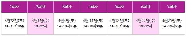 각 강좌별, 4시간 또는 4시간30분씩 총 7회